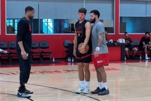 体育资讯8月29日讯 今日火箭官媒晒出谢泼德和范弗里特一起训练的视频,期间范弗里特不忘在突破方面对着小将指点一番。