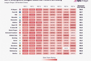 Opta使用个球队的实力排名体系进行分析(该体系将全球1.3万支球队纳入同一评估标准进行排名,得分越高的球队实力越强),对每支欧冠参赛队的8个对手取平均分,算出来数值越高的证明对应的赛程越困难, 结果1-18名的排名如下: