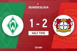 伤停补时7分钟。上半场比赛结束,不莱梅1-2勒沃库森。