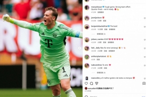 本场比赛诺伊尔首发出战,赛后他也在个人社媒晒出庆祝照片,配文写道:“一场艰难的比赛,球队付出了极大的努力,1/4决赛我们来了!”