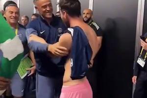 赛后在球员通道,梅西与恩里克、多纳鲁马、金彭贝等人拥抱攀谈。