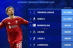 体育资讯9月2日讯 今夏主流联赛转会窗已经关闭,《转会市场》也统计了各大联赛的支出情况,值得一提的是利物浦和切尔西作为单一球队也被列入排名。