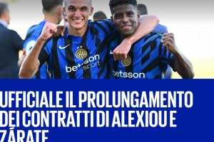 体育资讯9月3日讯 国米官方宣布和两名小将克里斯托斯-亚历克西乌(Christos Alexiou)和迪兰-萨拉特(Dilan Zárate)续约两年。