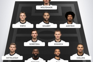 后卫:米特尔施塔特(斯图加特)、吕迪格(皇马)、若纳坦-塔(拜仁)、纳姆迪-科林斯(法兰克福)
