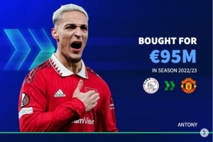 2022年夏窗,曼联以9500万欧元从阿贾克斯引进安东尼,今夏以2200万欧将其卖给贝蒂斯。净亏7300万欧。