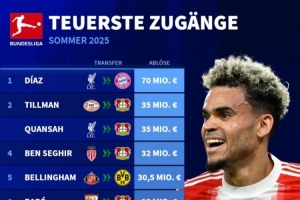 德甲今夏引援榜:迪亚斯7000万断崖领跑,蒂尔曼&宽萨领衔药厂5将