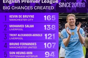 体育资讯9月7日讯 数据机构squakwa统计了17-18赛季以来的英超创造重大机会情况,德布劳内力压萨拉赫居首。