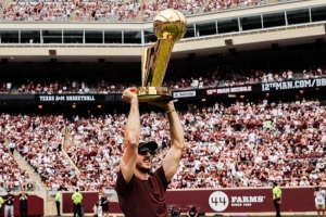 体育资讯9月7日讯 今日雷霆官方晒照,卡鲁索带着总冠军奖杯回到母校得克萨斯农工大学。