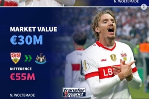 沃尔特马德(斯图加特→纽卡斯尔):身价3000万,转会费8500万,溢价5500万欧元