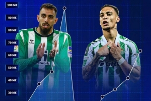 贝蒂斯2019-20赛季一共花费了1亿欧元,而本赛季他们投入6200万欧元,引进了安东尼等球员,这是球队自2019-20赛季之后的最高纪录。