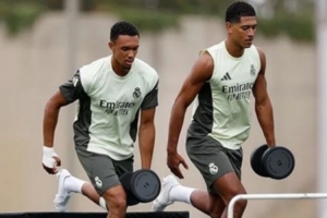 在皇马晒出的训练照中,贝林厄姆与阿诺德同框,两人一同进行训练。