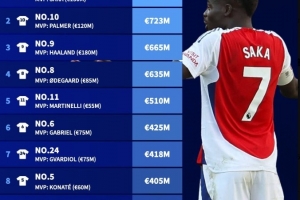 体育资讯9月9日讯 德国转会市场对英超球星球衣号码的市场价值进行排行,其中身披7号球衣的萨卡总市场价值达到7.71亿欧元居首。