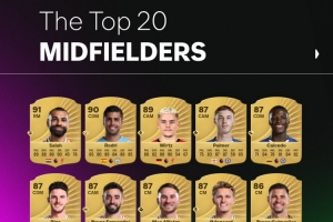 体育资讯9月9日讯 EA官方公布了FC26英超中场评分榜,萨拉赫高居第一。