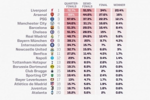 opta预测本赛季欧冠夺冠概率: