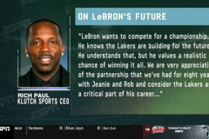 体育资讯7月1日讯 今日,ESPN湖人随队记者Dave McMenamin在电视节目中进一步报道了在詹姆斯执行球员选项后,其经纪人里奇-保罗所发布的声明。
