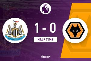 上半场比赛结束,纽卡斯尔联1-0狼队。