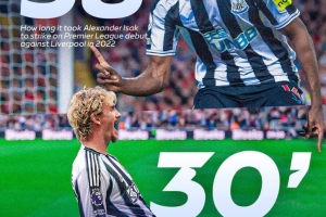 值得一提的是,纽卡上一位神锋伊萨克在纽卡首秀的第38分钟也很快取得进球,对手是新东家利物浦。