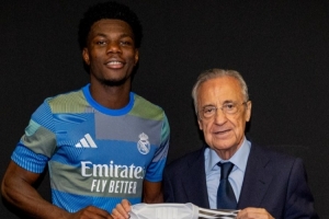 体育资讯9月14日讯 西甲第4轮,皇马客战皇家社会,琼阿梅尼迎来皇马生涯150场里程碑,皇马主席弗洛伦蒂诺向这名中场球员赠送了150场纪念球衣。