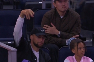 此役,勇士球星库里携二女儿莱恩现场观战,并在镜头前互动。