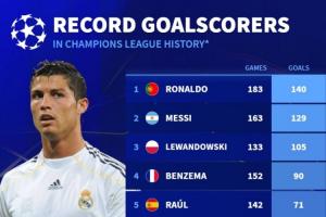 欧冠历史射手榜:C罗梅西分列前二,莱万第三,姆巴佩55球列第八