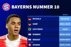 体育资讯7月1日讯 拜仁官方宣布,穆西亚拉将在世俱杯之后改穿10号球衣,德国转会市场列出了拜仁的10号球员。
