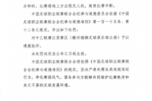 根据相关规定,中足联对江西赛区(赣州瑞狮俱乐部主场)予以通报批评。