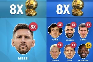 6.巴西 5次(罗纳尔多x2 卡卡、罗纳尔迪尼奥、里瓦尔多x1)