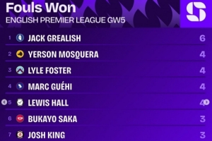 体育资讯9月24日讯 英超第5轮战罢,squawkafootball列各项数据排行,格拉利什是本轮造对手犯规次数最多的球员,共有6次。