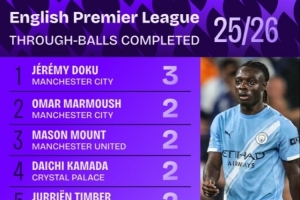 体育资讯9月24日讯 本赛季英超战罢5轮,“Squawka”统计了所有球员成功完成直塞次数的排名,曼城边锋多库以3次领跑。