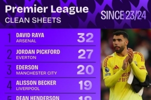 英超23/24赛季以来门将零封榜:拉亚32场第一,皮克福德27场第二