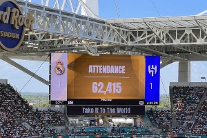 世俱杯小组赛第1轮,皇马在硬石体育场1-1利雅得新月,现场观众为62415人,球场容量为65000人,上座率96.02%