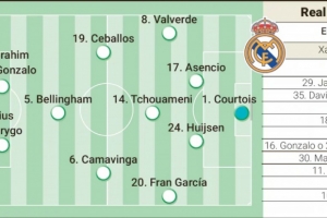 据《阿斯报》预测首发为:库尔图瓦;巴尔韦德、劳尔-阿森西奥、赫伊森、弗兰-加西亚;琼阿梅尼、卡马文加、塞巴略斯、贝林厄姆;迪亚斯或贡萨洛、维尼修斯或罗德里戈。