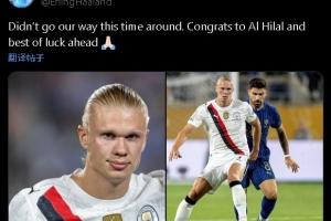 曼城前锋哈兰德更新社媒祝福新月:这次我们没能如愿。恭喜利雅得新月,祝你们未来好运。