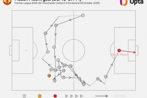 据统计,芒特进球前经过18次传球,这是本赛季英超进球中最多,而曼联上一次进球前有如此多传球还在2023年9月(B费进球)。