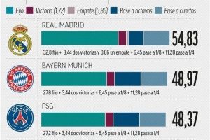 皇马5483万欧元:参赛保底奖金3280万、赢球奖金344万、平局奖金86万、晋级16强奖金645万、晋级8强奖金1128万
