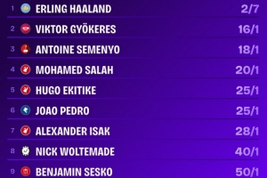 英超金靴赔率:哈兰德仅2/7为最大热门,约克雷斯1/16位居次席
