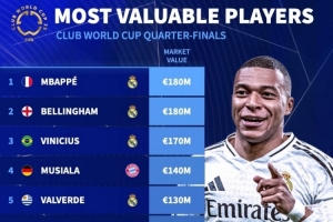 体育资讯7月3日讯 德国转会市场列出了世俱杯8强球员身价排名,姆巴佩、贝林厄姆、维尼修斯前三,前8名皇马占5席。