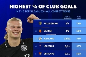 体育资讯10月7日讯 德国转会市场统计了本赛季球员进球占比,哈兰德攻入曼城57%的进球,占比并列第二高,姆巴佩54%、凯恩47%。