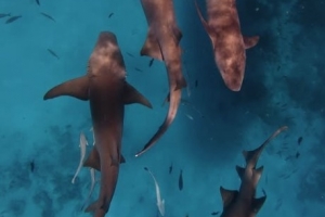视频中,库巴西潜入海中游泳,并和一群鲨鱼进行互动。