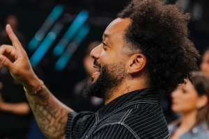 马塞洛与老队友克罗斯一起参加偶像联赛活动,他展示了自己的转球技术,一旁的克罗斯投来赞赏的目光。