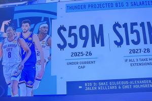 在现行的NBA工资帽下,雷霆三巨头(亚历山大、杰伦威、切特)在新赛季(25-26赛季)薪资合计5900万美元。