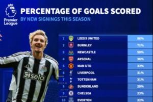 体育资讯10月9日讯 新赛季英超已经进行了7轮比赛,20支球队今夏新援作用如何?德国转会市场盘点了各队新援进球数占球队总进球数的比例情况,其中利兹联86%最高,阿森纳、曼联、利物浦分列位居第4、第5和第6。