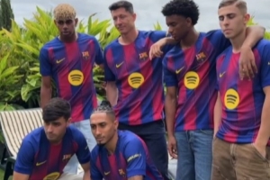 体育资讯7月3日讯 巴萨社媒晒出新赛季主场球衣宣传片拍摄花絮,亚马尔、莱万、拉菲尼亚、佩德里、费尔明等人出镜。