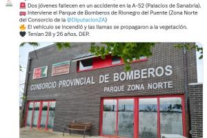 萨莫拉省议会在两个小时前发文:两名年轻人在 A-52(Palacios de Sanabria)的一场事故中丧生。