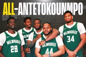 美媒Clutch Points晒出了一张全字母哥阵容的P图,并写道:“字母哥的另一位弟弟科斯塔斯目前效力于奥林匹亚科斯,他大哥弗朗西斯在转行踢足球前也打过篮球。”