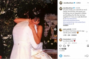 贝克汉姆社媒晒出与维多利亚在婚礼上拥抱的照片,并写道:“26年前的今天,你对我说了‘YES’。结婚周年快乐,谢谢你给我带来了可爱的孩子们,共同创造了我们现在的生活。我爱你,贝克汉姆夫人。”