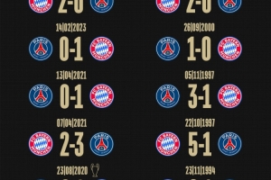 拜仁官方社媒晒出了对阵巴黎的历史战绩,拜仁8胜6负略占优势,打进19球丢15球。