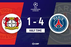 半场-巴黎暂4-1勒沃库森 安德里希、扎巴尔尼染红K77传射杜埃双响