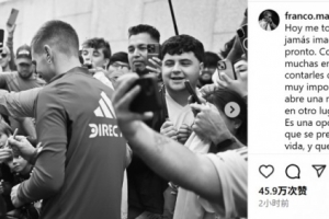 我满怀感激离开。感谢球迷无条件的爱,感谢俱乐部每个人的栽培,感谢队友共享这份激情,更感谢我的家人始终相伴。河床教会我:追梦需要谦卑、拼搏,还有对球衣的热爱。