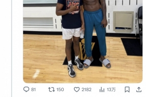 体育资讯7月5日讯 今日,湖人前锋詹姆斯前往骑士训练馆进行了训练,并与骑士夏联新秀丹佛-琼斯合影。